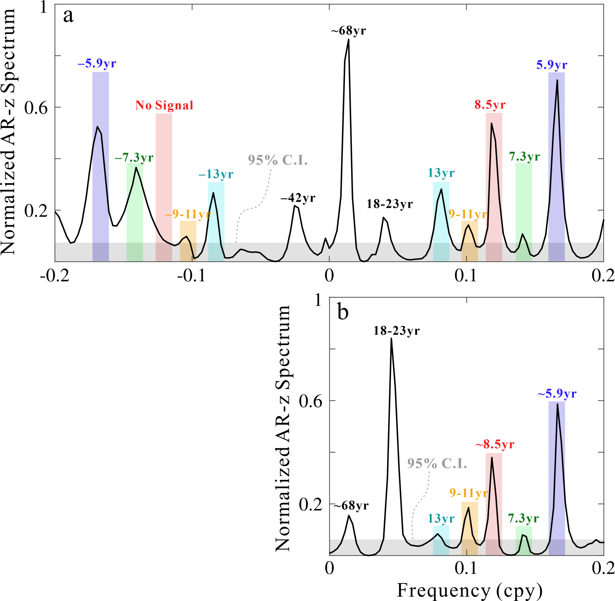 地球极移/日长中可能存在不同的十年、亚十年尺度的周期性变化。由于可用数据长度有限且信号相对微弱,如何准确探测出这些周期性变化是一项极具挑战的工作,而如何进一步解释这些变化的物理成因更是国际性难题。利用团队成员早期提出的z域谱分析方法--AR-z谱(如图1),团队在2019年首次发现日长变化中存在一个约8.7±0.2年的周期性信号(Ding, 2019 EPSL),但未作进一步解释。随后又在极移变化中观测到几乎相同周期的信号,并建议其为可能的内核晃动信号,这也是国际上第一次找到内核晃动的可能信号(Ding et al, 2019 GRL)。在最新的研究中,团队首先确认了早期在极移中所建议的信号确实为内核晃动信号,且通过进一步分析极移和日长中约8.5年的时变特征,发现它们具有很好的一致性,理论上应来自于相同激发源。地球自转理论采用2-D地球模型,假设内核自转轴与地幔自转轴重合,所以内核晃动信号只可能出现在极移分量而不可能出现在日长分量中;而实际高度异质的3-D地幔的2阶0次形状(“扁”)在内部具有很大的不确定性,对称轴也会发生变化,尤其是核幔边界处,而异质的(下)地幔又会对内核进行塑形。基于此,团队构建了一个内核自转轴与地幔自转轴存在微小倾斜的模型(如图2所示),也即内核存在一个~0.17°的静态倾斜,发现该倾斜可完美解释观测结果。这也是国际上首次由实证证实内核存在静态倾斜。除此之外,所探测的内核晃动信号周期可直接用于约束地球内外核边界处的密度跳跃,该跳跃值也是地学基础研究中一个仍未被很好确定的参数。