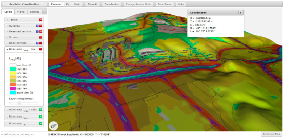 这个指标可以利用基于OGC标准的方法评估。基于欧洲标准对噪音地图的三维可视化已经通过基于OGC CityGML标准的INSPIRE建筑模型实现(图6)。