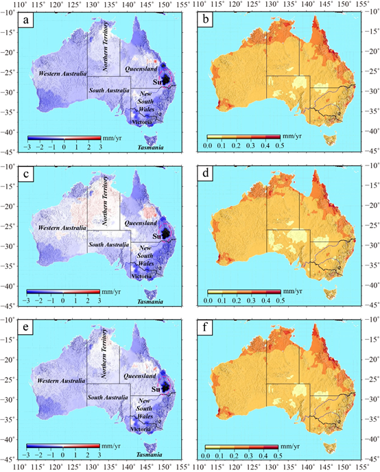 针对陆地垂向运动复杂的物理源问题,课题组综合分析了GPS垂向运动的年际波动和垂向形变场,并据此引入了一种GPS成像技术,定量给出了整个澳大利亚区域陆地垂向运动影像。在高分辨率的空间尺度上,澳大利亚大地观测的陆地沉降可能与地下含水层的地下水耗竭有关,而长波信号(包括趋势)则可能与参考框架误差和深部的构造变形有关。本研究为空间大地测量定量约束的陆地垂向形变及其可能的地球物理机制提供了重要参考。
