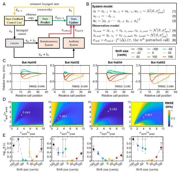 本研究提出并验证了感觉误差纠正(Sensory error correction)是回声定位蝙蝠发声控制的机制这一假说。感觉误差纠正是人类言语(Speech)控制的机制,而多年来研究者认为回声定位蝙蝠的发声控制机制与人和其他哺乳动物的控制机制是完全不同的。本文尝试将人类言语控制的状态反馈控制(State feedback control,SFC)的模型用于解析蝙蝠回声定位声波的精准控制。在实验方面,本研究利用FPGA技术搭建了一种能够对蝙蝠的叫声进行实时处理并以此为模板在线创造变频(变调)听觉反馈的实验装置,测量了多个蝙蝠个体对于变频(变调)回声的发声响应。在此基础上,使用包含多状态窗口的卡尔曼滤波器对蝙蝠的音调调整进行数学建模,综合考虑了体感反馈、听觉反馈以及感觉延迟等机制,并引入蝙蝠个体对于不同音调偏移量的不确定度作为关键参数,对实测的蝙蝠声音调整模式进行了准确的数值预测。基于此,本文确定了回声定位蝙蝠使用与人类言语类似的状态反馈控制的原理进行精准的实时发声频率控制。
