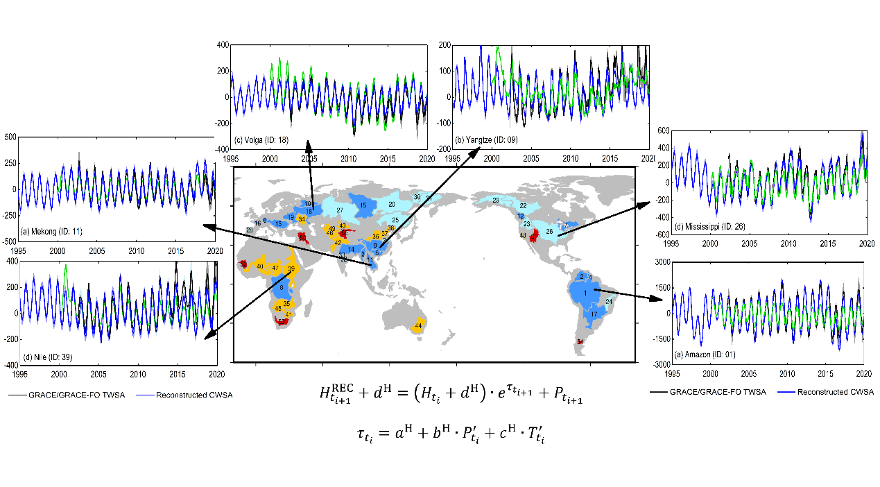 研究团队首先独立提出了一个重建陆地水储量异常长时间序列的统计模型,该模型以降水和温度数据作为驱动,重建了陆地水储量异常序列中气候驱动的部分,并分析了在高强度人为干预区域,从GRACE观测的总水储量异常信号中分离人为干预信号的可行性。