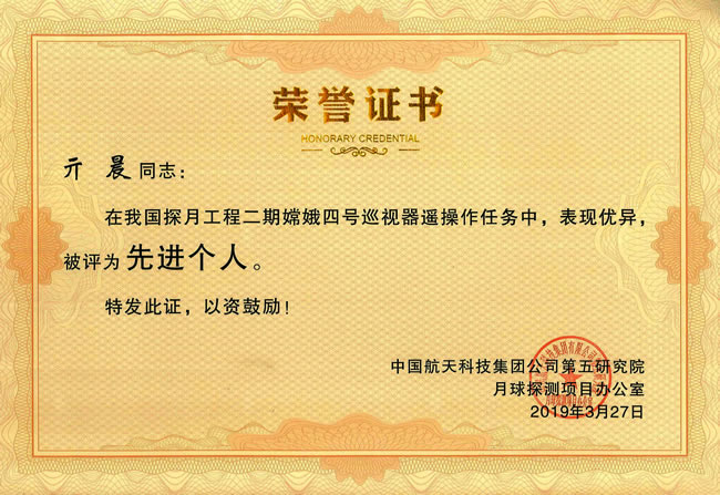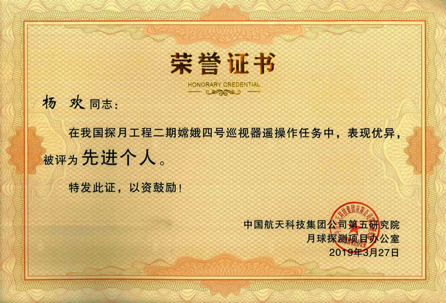 脱裤吧 14级博士研究生亓晨和杨欢参加嫦娥四号任务支持工作,圆满完成任务,被中国航天科技集团公司第五研究院月球探测工程项目办公室评为嫦娥四号任务支持“先进个人”。