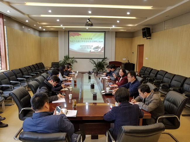 3月22日下午,学院党委中心组扩大会议集体学习了十九届三中全会和全国两会精神。学院党委委员、教工党支部书记参加了学习活动。党委书记孙萍主持学习活动。