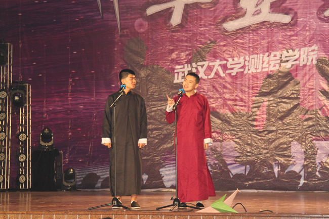 说唱《西门少年》诉尽青春意气,大三同学的相声表演惟妙惟肖,扛着“水准仪”和尺子上台的舞台秀表演《诗酒趁年华》更是勾起大家大学四年最亲切的回忆。
