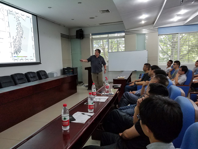 本次报告分为两部分:第一部分以日本东北、智利等大地震为例讲述了联合大地测量数据(InSAR和GPS)、地震波和海啸等数据等进行地震反演研究,对日本及智利地震的具体情形进行了具体分析;介绍了利用数值模拟工具来研究地震的震前、同震、震后不同阶段的形变特征。第二部分以2016年新西兰地震为例,针对利用地震波数据与大地测量数据各自研究结果的不同,提出联合多种数据来研究该地震断层破裂面滑动分布、断层运动方式和库伦应力变化等,最后得到更为合理的解释和结果。在报告过程中,Kevin Furlong 教授风趣幽默,报告内容生动、图表详实,使与会师生对联合多种数据进行地震相关反演工作有了更深刻的理解与认识。报告结束后,与会人员就感兴趣的问题与Kevin Furlong 教授进行了交流讨论。