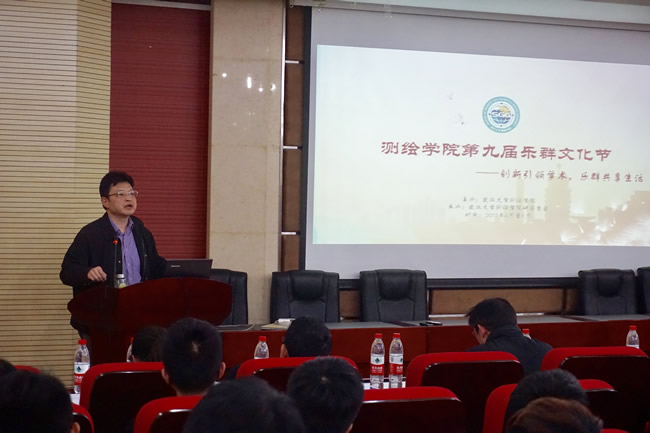 4月10日下午,脱裤吧 第九届“乐群文化节”开幕式在202报告厅举行。副校长李建成院士应邀作“乐群论坛”首场讲座。院长姚宜斌、院党委副书记张朝龙,以及学院学工办和团委老师出席了开幕式。本次开幕式暨学术讲座吸引了120余名学生前来参加。