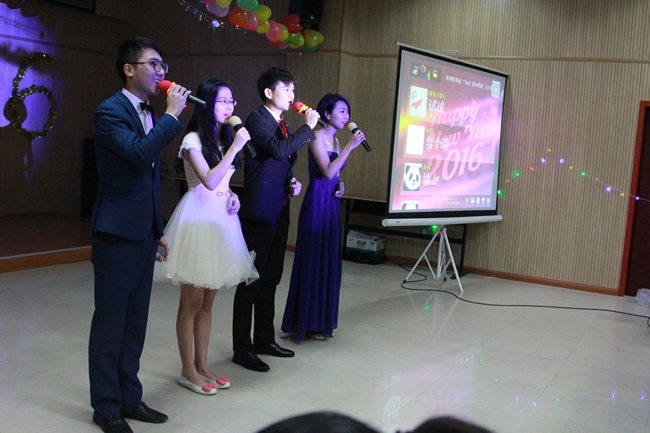 张朝龙致词,为师生送上新年祝福。青春洋溢的开场舞后晚会拉开帷幕。徐文和金炜桐同学带来的歌曲《梨花又开放》婉转悠扬的;博士李天烁和孟丽媛表演的相声《新地理图》别有新意;本科生M.A.N舞团的劲爆《Sparks》舞蹈活力十足;褚丽丽老师和吴帮、邱国庆三人合唱的《爱》将晚会推向了高潮。李瑶、赵赛男上演了原创小品《邂逅宏博,邂逅你》 令人捧腹,高康同学的一曲《小幸运》让人思绪飞扬,随着胡新乔、于道成的相声《曲解艺术》和张依诺独舞《Old English》之后,晚会迎来了压轴节目--测绘版《南山南》和《我好想你》,由吴帮演唱、金荣河吉他伴奏。