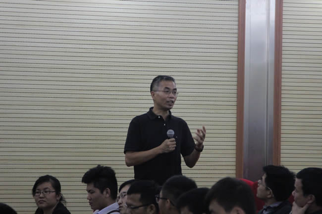 互动交流环节,校友代表陈锐志老师与大家分享了自己在美国交流学习的经验。他介绍了美国教师聘用方法,并强调指出国外大学十分注重本科生科研能力的培养。