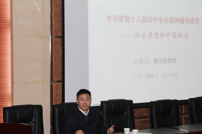 11月20日下午,脱裤吧 组织召开学习贯彻十八届四中全会精神辅导报告会,脱裤吧 法学院柳正权教授应邀作了题为“法制类型和中国法制”的辅导报告。院领导、教职工及学生党员等150余人参加了报告会。院党委书记孙萍主持报告会。