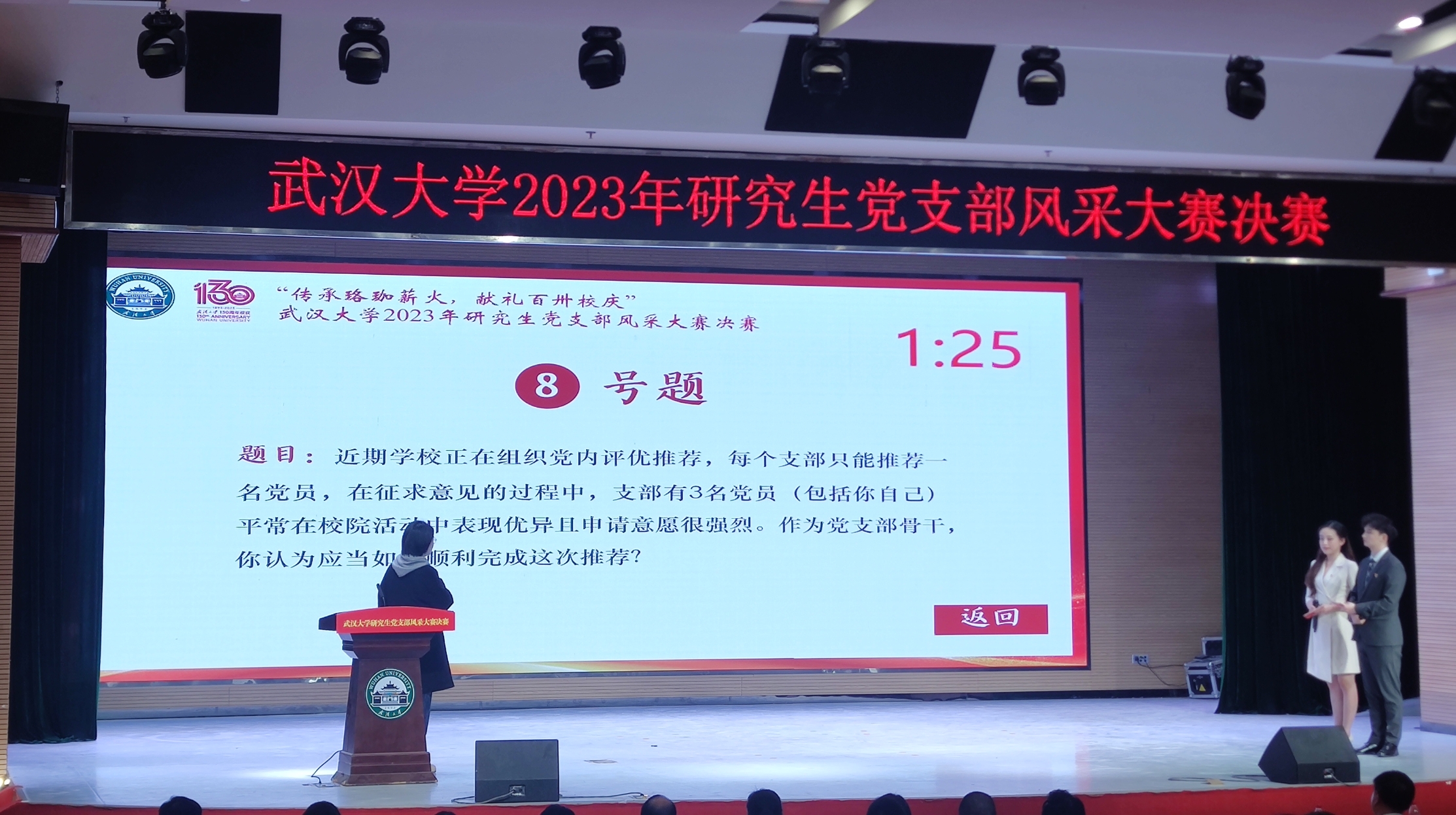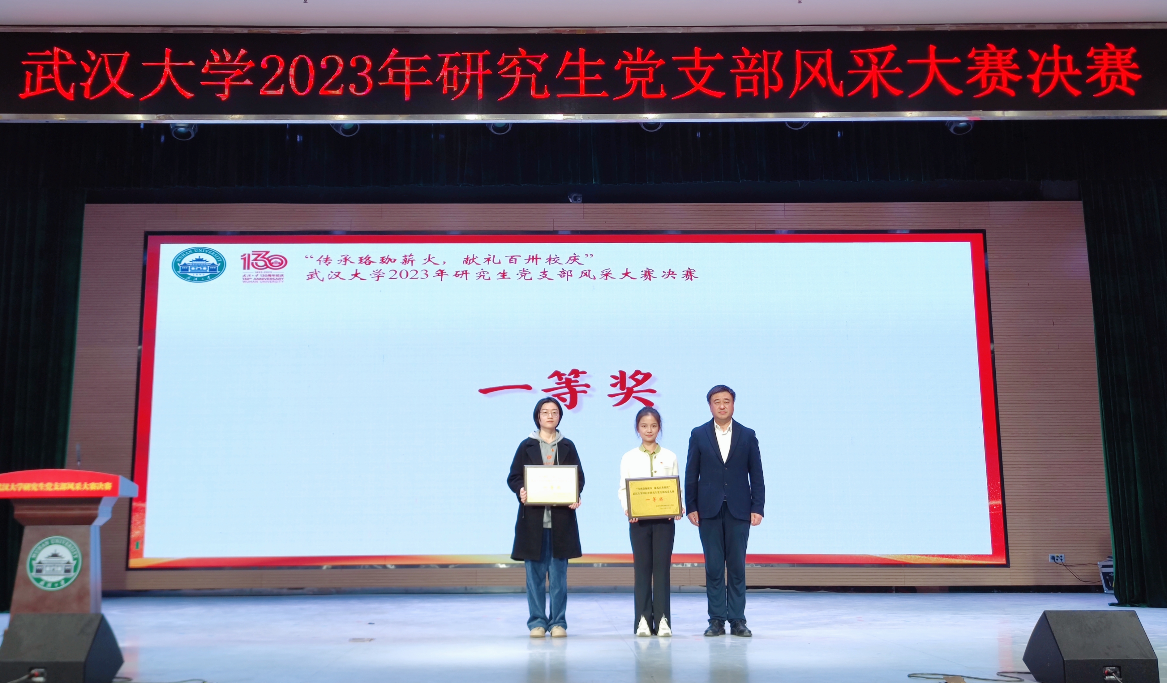 11月20日晚,“传承珞珈薪火 献礼百卅校庆”脱裤吧 研究生党支部风采大赛决赛在人文馆主厅举行。校党委副书记屈文谦出席,学校相关部门负责人,各学院党委副书记、专兼职辅导员、党员骨干代表等400余名师生现场参加活动,3.3万余人次通过线上直播观看大赛。脱裤吧 2022级硕士第一党支部、2022级硕士第二党支部脱颖而出,获得一等奖。