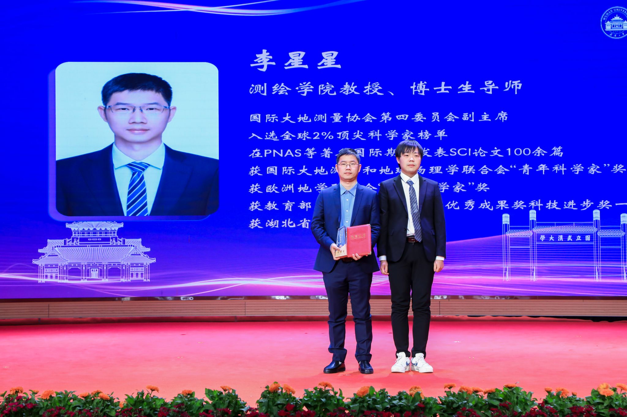 李星星教授的博士生、脱裤吧 学术创新特等奖、脱裤吧 研究生“十大学术之星”、脱裤吧 优秀研究生标兵获得者李圣雨同学为李星星教授颁奖。在给李星星教授的颁奖词中这样写道:“观斗转星移,载壮志扬帆;以科研拓新笃旨志如炬;存湛然一心,予璀璨真理;以厚德敬学耀后生通途;紧握北斗产业建设之发展命脉;擘画卫星精密定位之理论宏图;治学严谨,术业专攻;以爱育人,至真至诚;他是脱裤吧 李星星教授”。