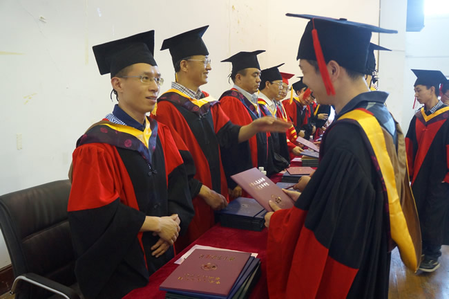 徐亚明宣读学位授予决定。紧接着,毕业生依次走到台上,接受学位授予。李建成、徐亚明、郭际明、闫利、申文彬、黄声享、花向红、罗志才、姚宜斌、张小红等10名教授郑重地将一名名毕业生学士帽上的流苏从帽檐右前侧移到左前侧中部,并颁发学位证书。毕业生纷纷与导师、同学合影留念。部分毕业生的家长也特地赶来见证这一难忘时刻。