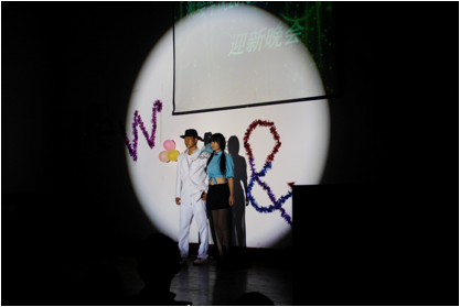 19时10分,晚会在服饰展《时空轮回》中拉开序幕,“只为与你相约,等待下一次重逢”,诗意的引语,舒缓的音乐,优雅的服装,创意尽显。由院舞协指导,新生表演的舞蹈《舞动青春》 赢得掌声一片。
