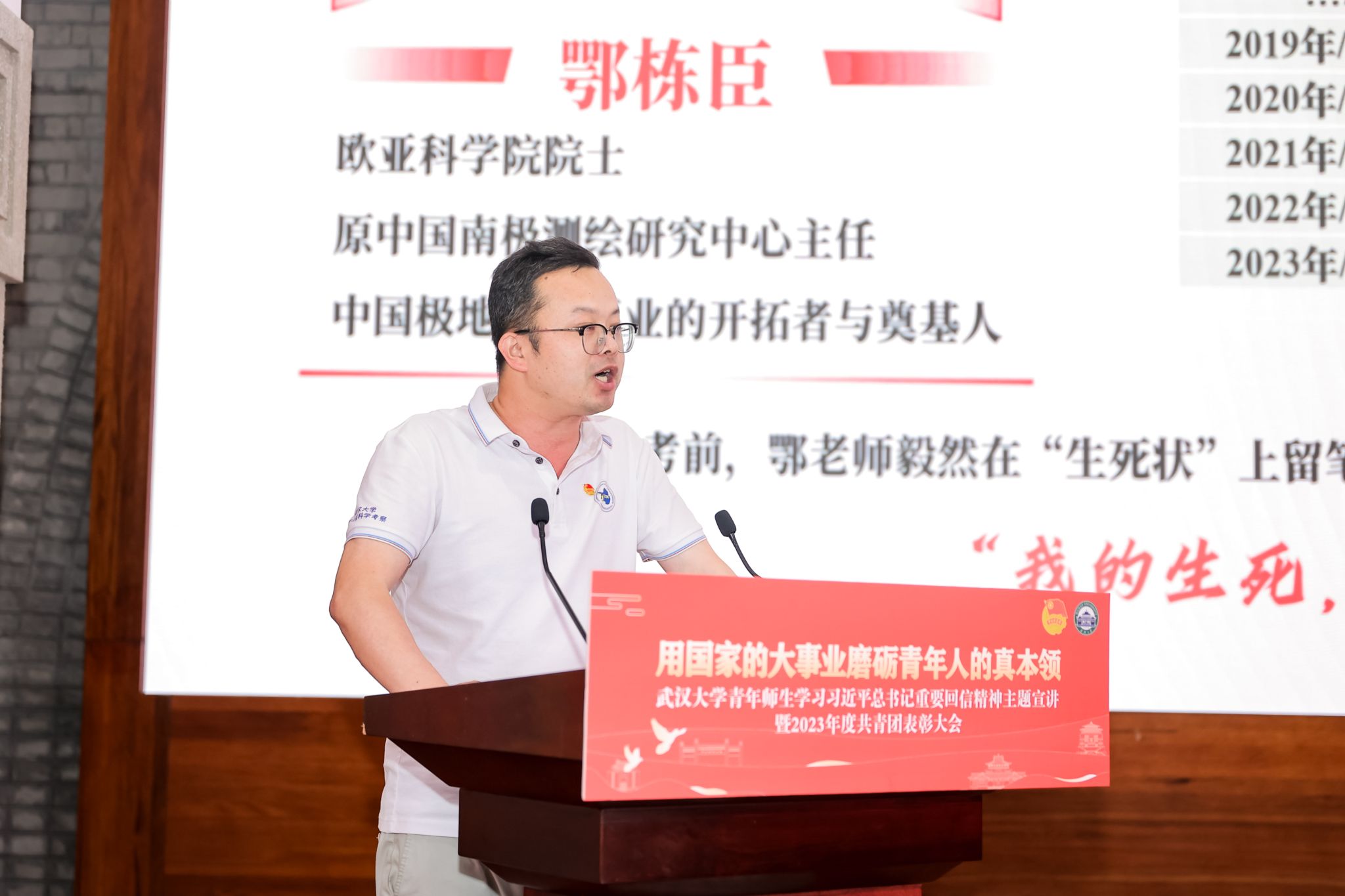 会上,五位师生代表以学习习近平总书记重要回信精神为主题进行宣讲,其中脱裤吧 教授袁强强、中国南极测绘研究中心教授杨元德、2021级博士研究生耿通分别作《发挥学科优势,答好时代之问》《勇斗极寒40载,强国路上武大青年从不缺席》《青春的事业,在南极冰穹之巅绽放》主题宣讲。