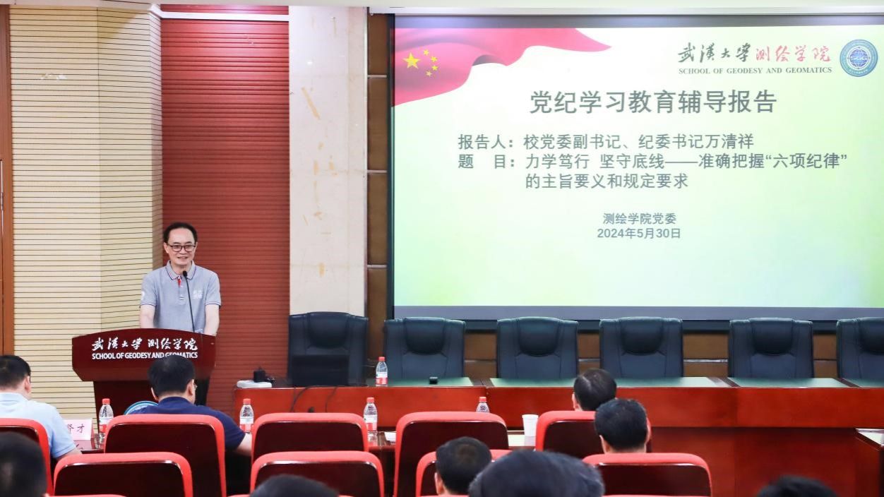 2024年5月30日下午,脱裤吧 在202报告厅隆重举行党纪学习教育专题辅导,特邀学校党委副书记、纪委书记、国家监委驻脱裤吧 监察专员万清祥同志作为主讲嘉宾,为脱裤吧 、导航中心和南极中心的党政领导、全体教职工党员、学生党支部书记以及离退休党支部书记等讲授党纪学习教育专题党课。学习辅导活动由学院党委书记晏金柱主持。