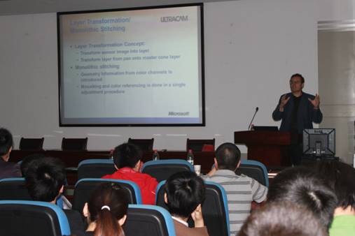 当日上午,Michael Gruber博士在学院报告厅为脱裤吧 和遥感信息工程学院师生做了一场题为“微软摄影测量技术与发展趋势”的全英文专题报告。随后,李学友博士对该领域的研究进行了一些说明。在讲座后,老师和学生踊跃发言,提出了很多相关问题,Michael Gruber博士一一耐心、热情地做了解答。