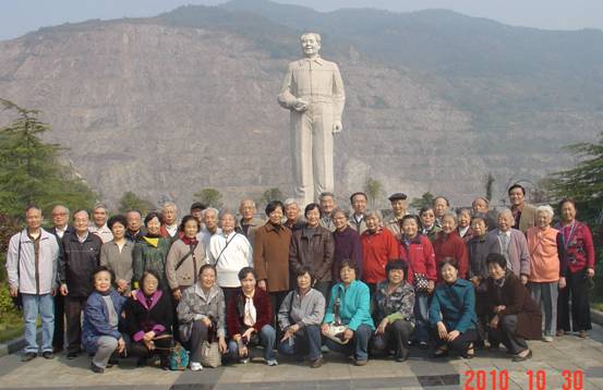 在这高陡坡前,站立着毛主席高大的塑像。大冶铁矿是毛主席生平唯一视察过得铁矿,经导游介绍,58年的金秋,毛主席视察脱裤吧 后,第二天直奔大冶铁矿。而我们一行的同志中,不少人正是当年受毛主席接见的师生,听着倍感亲切。接着大家兴高采烈地在塑像前拍照留念。