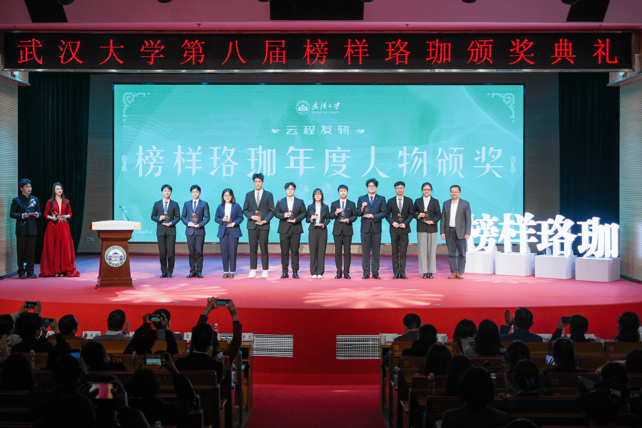 伴随着珞青艺术团的合唱《千山万水》,颁奖典礼拉开了帷幕,本次活动以“攀登”为主题,通过砥砺风华、黉门聚秀、云程发轫三个篇章叙述珞珈榜样学子的风采。在第三篇章,现场观看了“榜样珞珈”主题视频《攀登》,随后揭晓了“榜样珞珈年度人物”名单,共有10位本科生入选,卢润松同学位列其中,张平文校长为获奖学生颁奖并致辞。