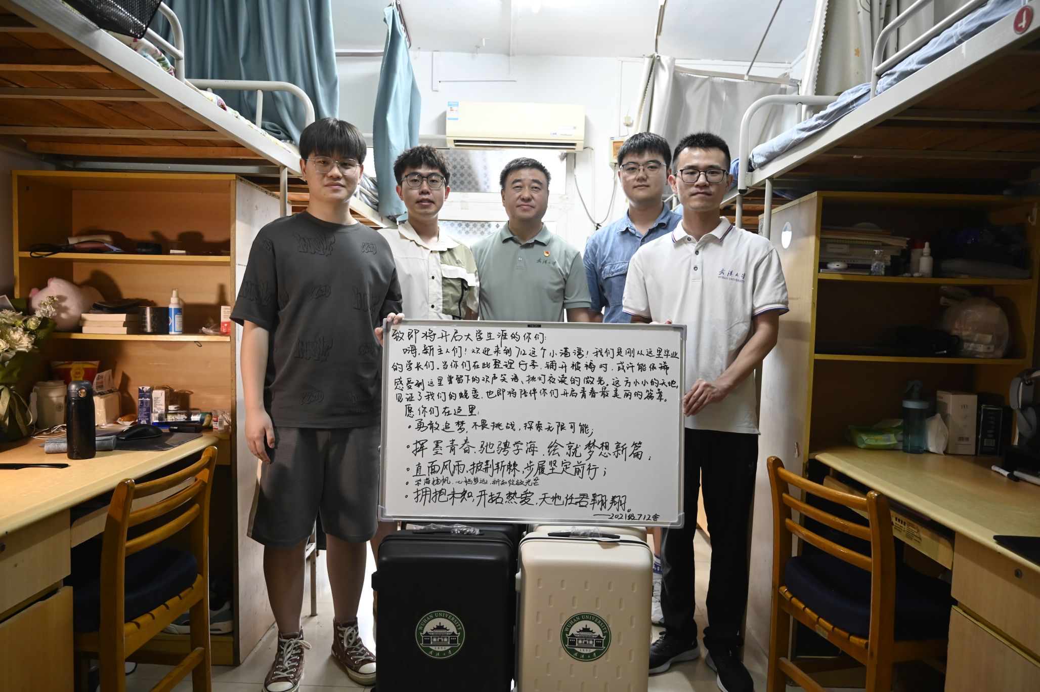 在走访学生宿舍过程中,屈文谦亲切地与毕业生交谈,仔细询问同学们的毕业去向,对毕业生们所取得的成绩表示祝贺,并为他们送上了学校精心准备的毕业纪念品,表达了母校对同学们深深的祝福与期许。信息学部16舍702的4位同学全部成功推免,连续四年获评“脱裤吧 文明寝室”,连续两年获评“脱裤吧 文明寝室标兵”,屈文谦一行对寝室文化建设给予充分肯定,指出了宿舍氛围和风气的重要性。