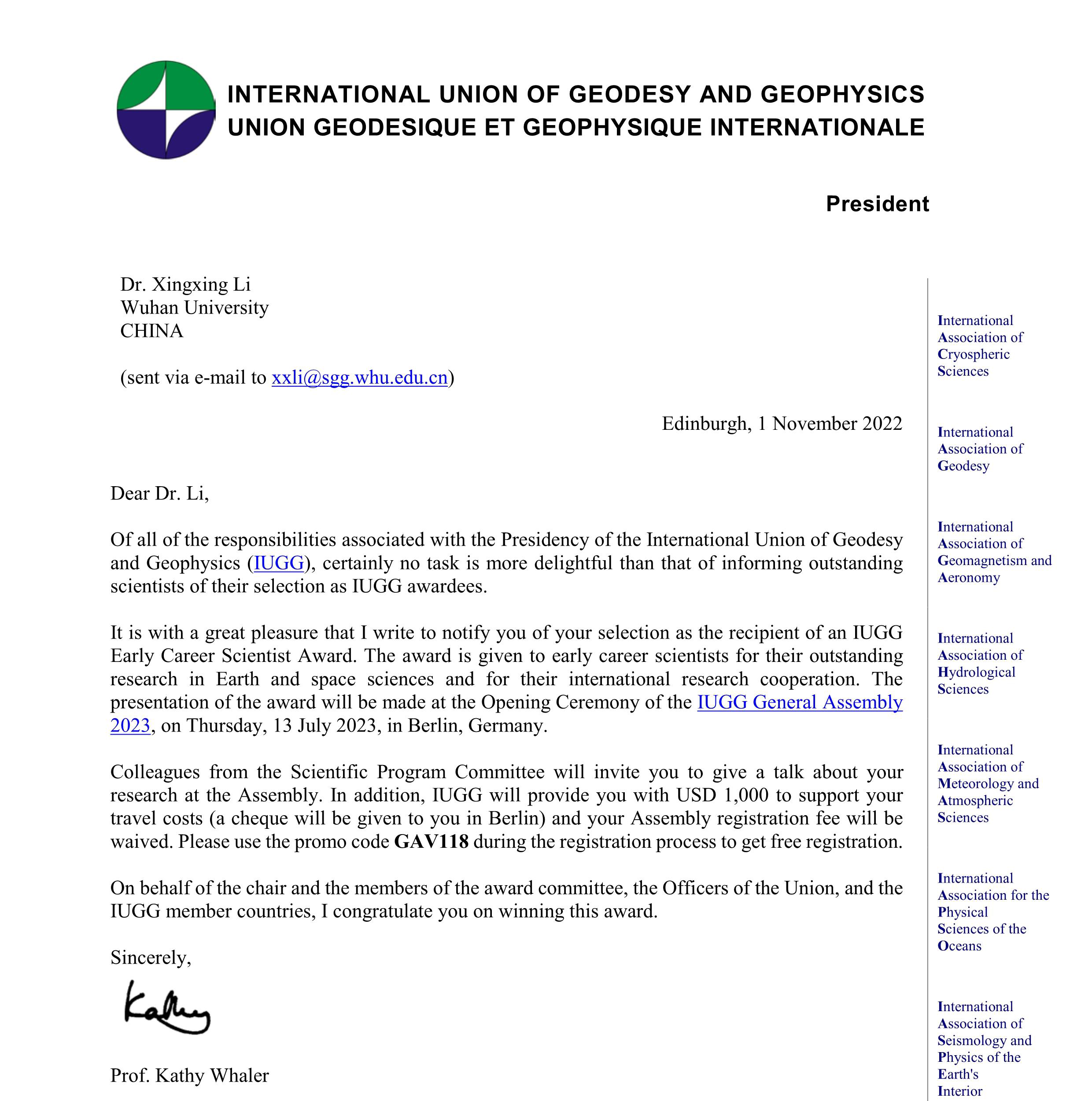11月1日,国际大地测量和地球物理学联合会(International Union of Geodesy and Geophysics,IUGG)官方宣布,脱裤吧 李星星教授荣获IUGG青年科学家奖(Early Career Scientist Award)。