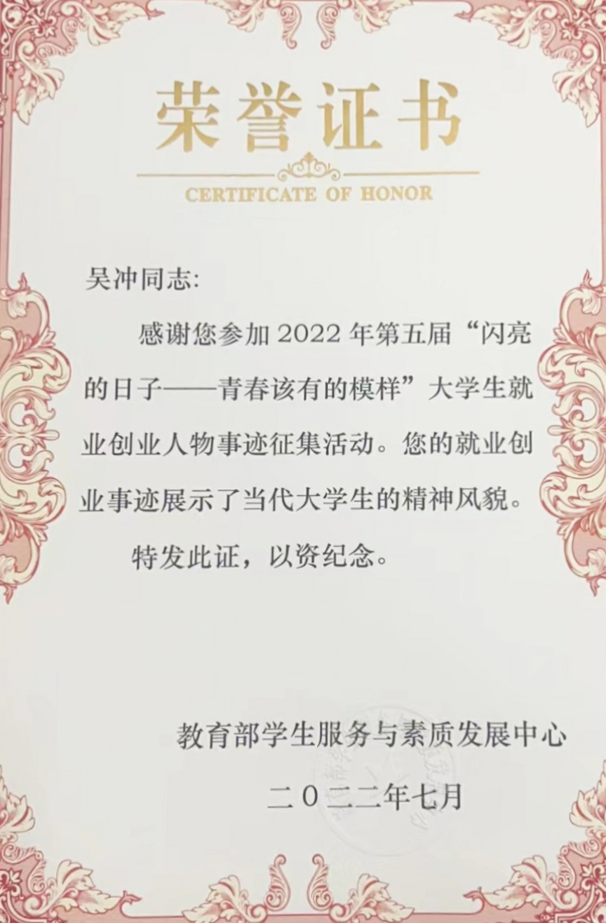 学院研究生吴冲获评大学生就业创业年度人物